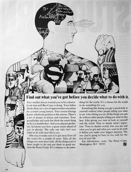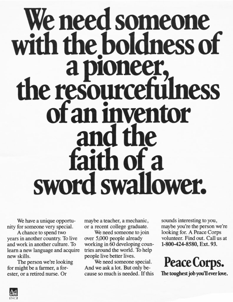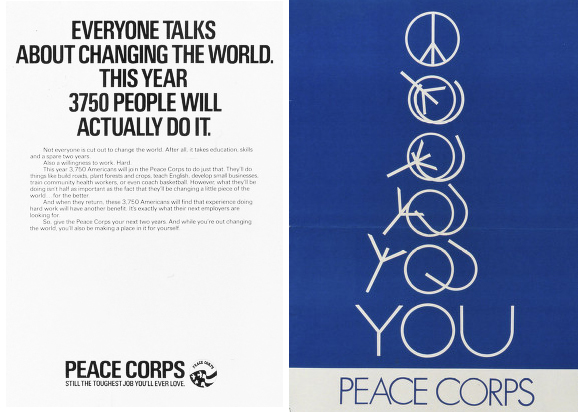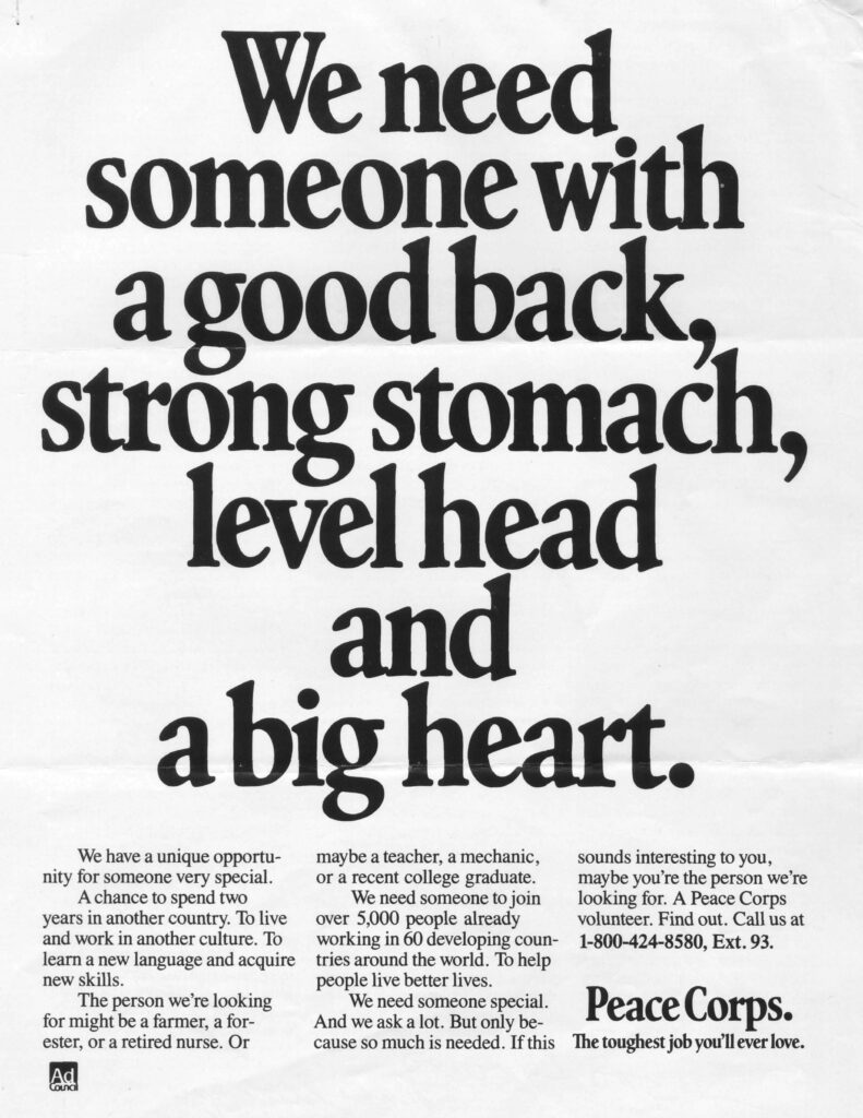 Curious to find more examples of vintage Peace Corps ads, I found the Peace Corps Digital Library Collection and within it a treasure trove of vintage posters and print ads. In the late 1960s, the Young & Rubicam agency worked with the Ad Council on a Peace Corps PSA campaign. Interestingly, Young & Rubicam is responsible for coining the expression, “The toughest job you’ll ever love.” See below for some of my favorite ads.