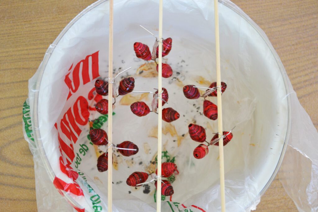 Materials used: paperclips (three per small rack), wooden skewer, plastic bag, bowl, and tape.