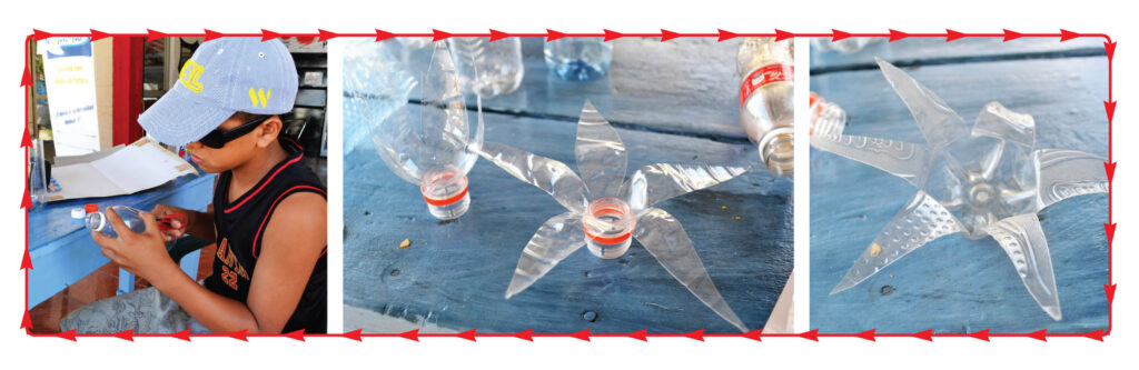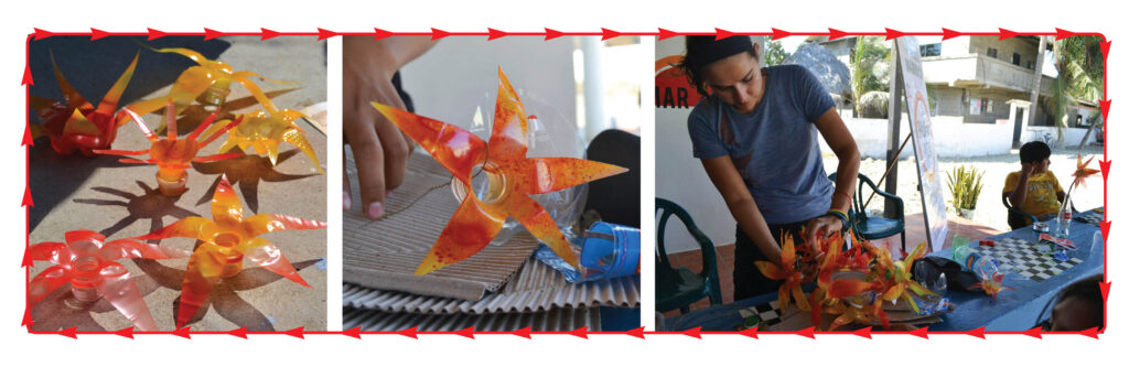 Cut bottles in half and cut out petal shapes from each side. Then, fold each of the petals down to form flower shape. We used a hammer and nail to make a small hole in the bottle half of the bottle since it didn´t have a hole.
