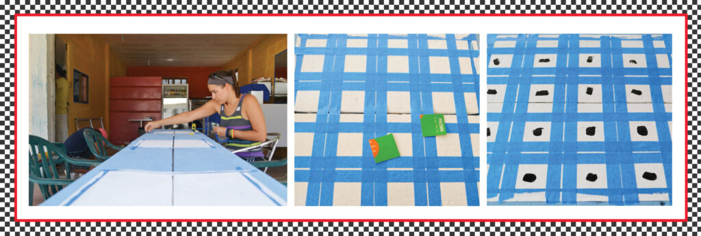I painted the first part of black boxes and waited for them to dry. It didn´t take long and then I was ready for some of the teens at the youth center to help me pull off the painter´s tape. Then, I re-taped the boxes I couldn´t paint before and painted those black.