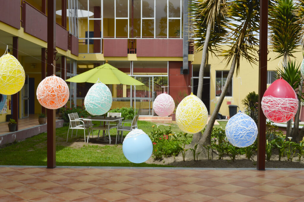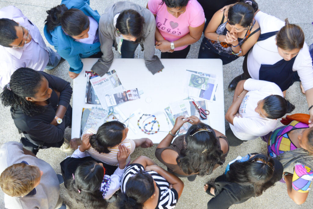 Make these bracelets by cutting magazine paper strips and gluing them to cardboard tubes. Seal the paper by using varnish or clear nail polish. This example shows one step further of wrapping colorful string around the outside.Paul created this earring in the shape of a feather using material from the inner tubes of tires. Tires are often burned here in Ecuador, which is bad for the environment and bad for people, making this a very important material to re-purpose. You can also use this rubber to make wallets or bags.Use magazine or newspaper folded into strips to create vases, bowls, trivets, or even jewelry. This image shows the bottom of a vase made from magazine strips. Use varnish to seal the paper and add a plastic bottle inside of the vase to hold the water.Noralma is teaching a group of participants how to create beads from magazine paper. Mujeres Cambia members also presented on the business behind Mujeres Cambia.This project isn’t exactly recycled (I suppose you could find a natural fiber or re-use old string) but it makes for a nice photo. Place school glue and string (or find a material to re-use) around a balloon and wait for it to dry completely to create a bowl or fixture for around a light.