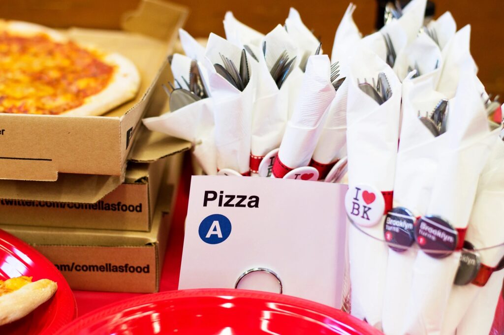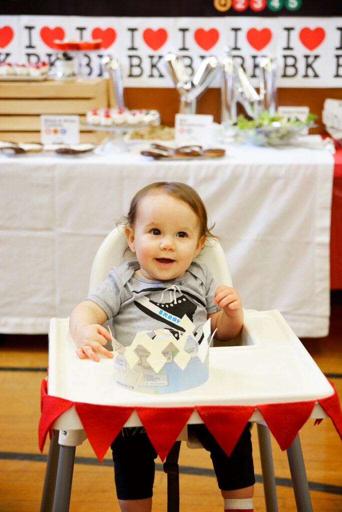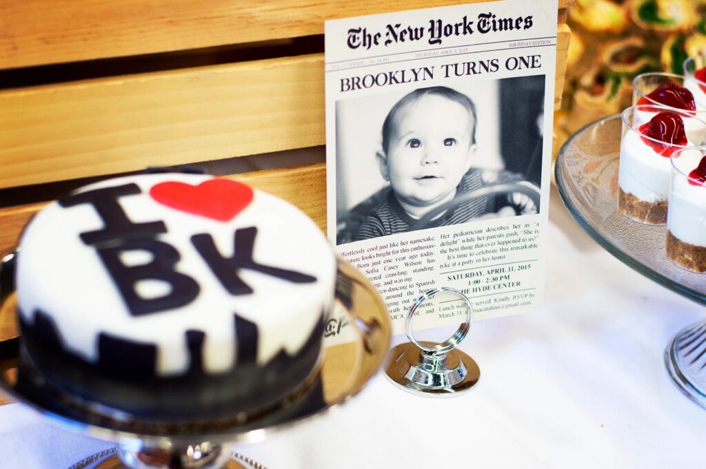 I took myself on as a client and worked on Brooklyn’s party from the invitations (the New York Times image) and signage, to the baked goods, labels, buttons, and table design. Not shown are the flags made from subway maps, the theatre area where we showed her video montage, the play area, and the activity tables.